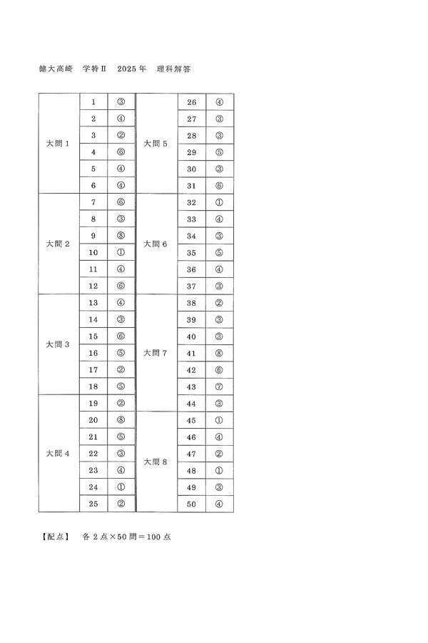 2025年度入試過去問題  学特入試II(理科 解答)(1ページ目)|高崎健康福祉大学高崎高等学校の入試過去問