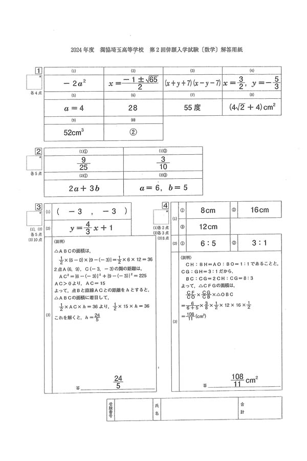 2024年度入試過去問題 第2回併願入試(数学 解答)(1ページ目)|獨協埼玉高等学校の入試過去問