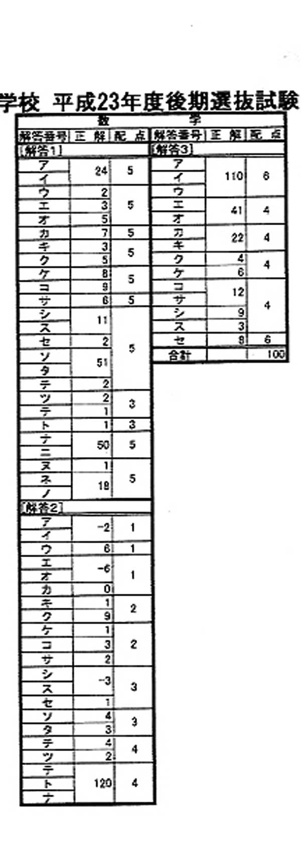 平成23年度入試過去問題 後期(数学 解答)(1ページ目)|千葉敬愛高等学校の入試過去問