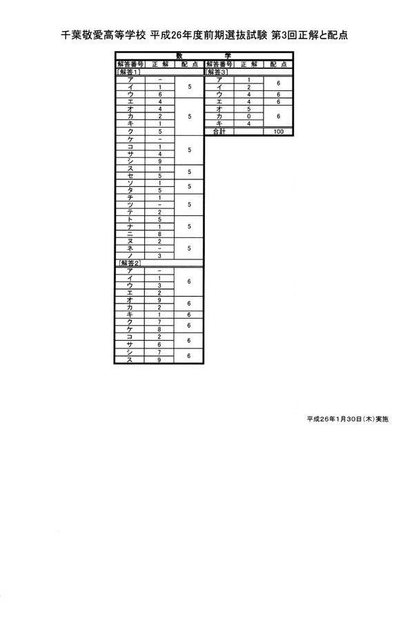 平成26年度入試過去問題 第3回(数学 解答)(1ページ目)|千葉敬愛高等学校の入試過去問