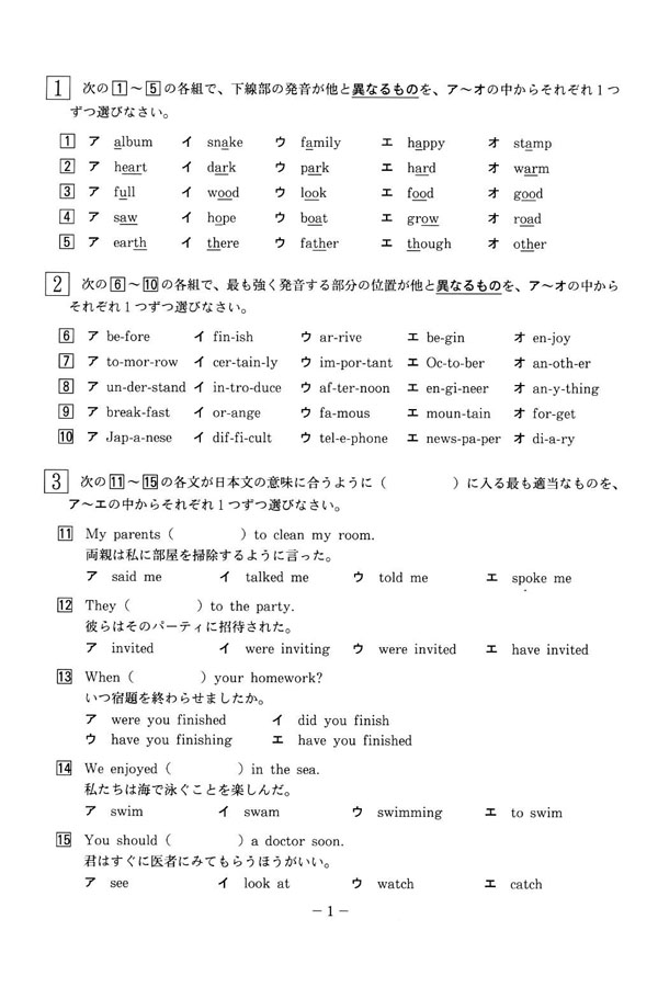 平成26年度入試過去問題 第1回(英語 問題)(1ページ目)|千葉敬愛高等学校の入試過去問