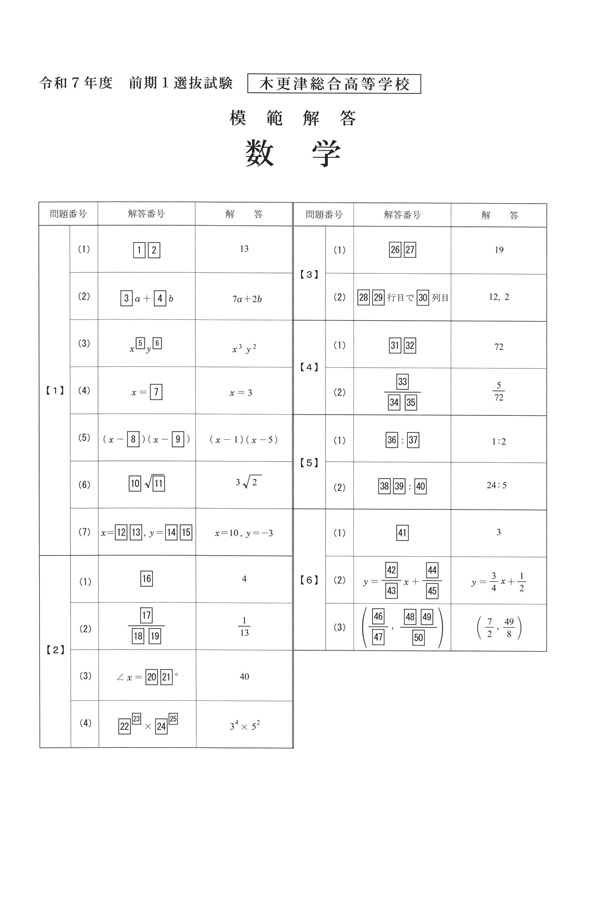 令和7年度入試過去問題 前期1(数学 解答)(1ページ目)|木更津総合高等学校の入試過去問