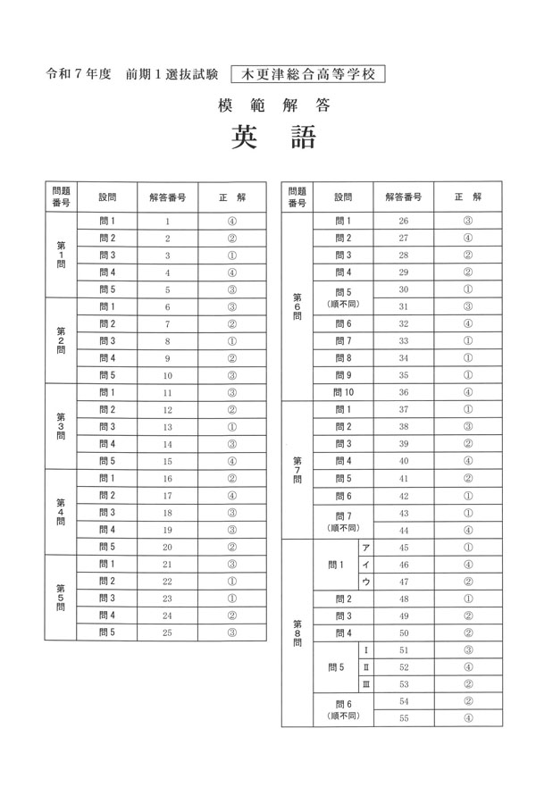令和7年度入試過去問題 前期1(英語 解答)(1ページ目)|木更津総合高等学校の入試過去問