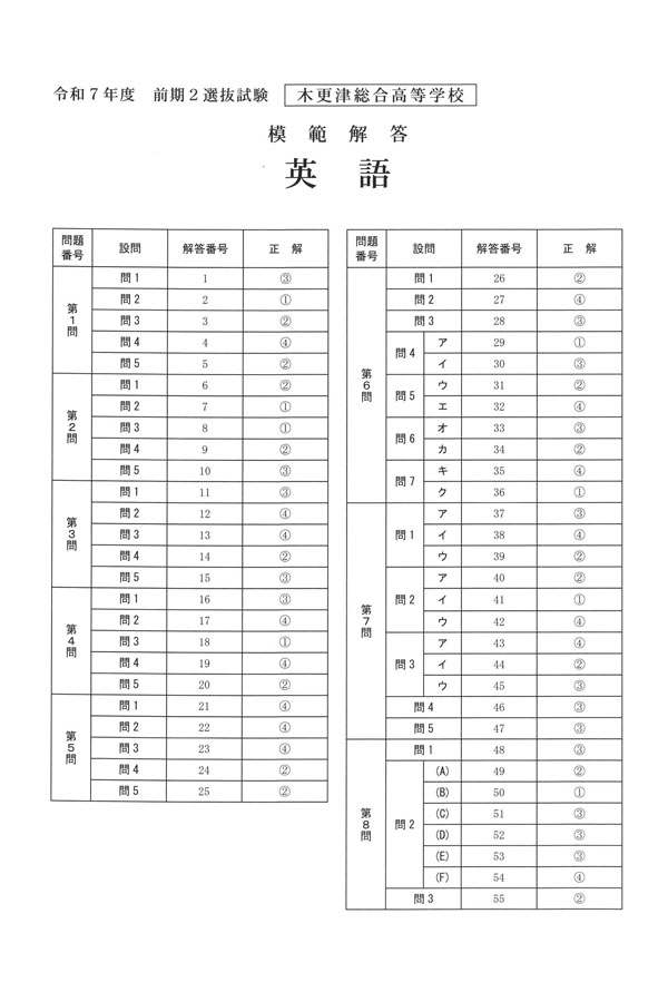 令和7年度入試過去問題 前期2(英語 解答)(1ページ目)|木更津総合高等学校の入試過去問