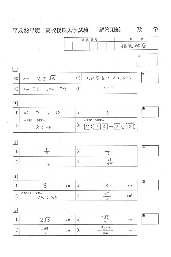 平成28年度入試過去問題 後期(数学 解答)(1ページ目)|芝浦工業大学柏高等学校の入試過去問