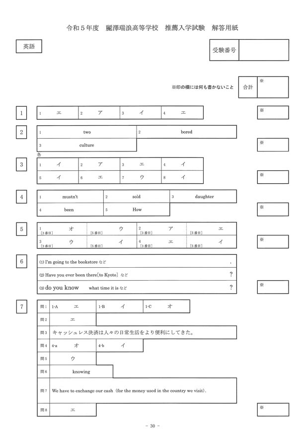 令和5年度入試過去問題 推薦(英語 解答)(1ページ目)|麗澤瑞浪高等学校の入試過去問