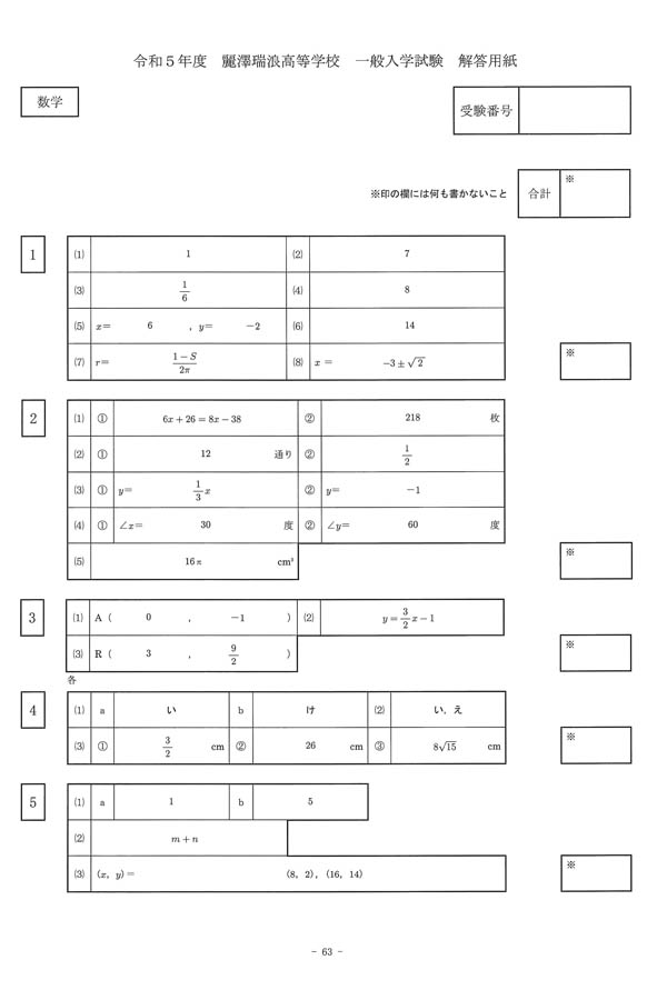 令和5年度入試過去問題 一般(数学 解答)(1ページ目)|麗澤瑞浪高等学校の入試過去問