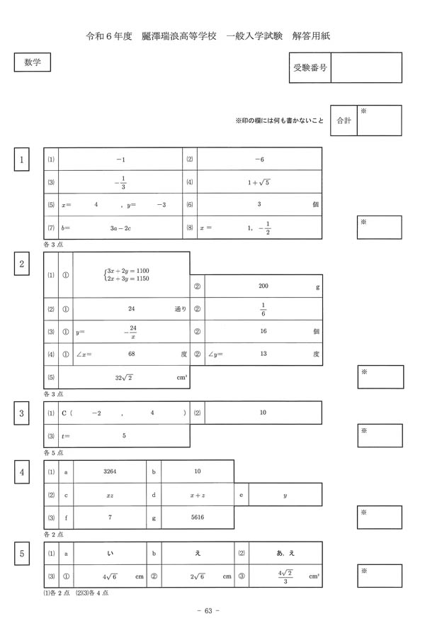 令和6年度入試過去問題 一般(数学 解答)(1ページ目)|麗澤瑞浪高等学校の入試過去問