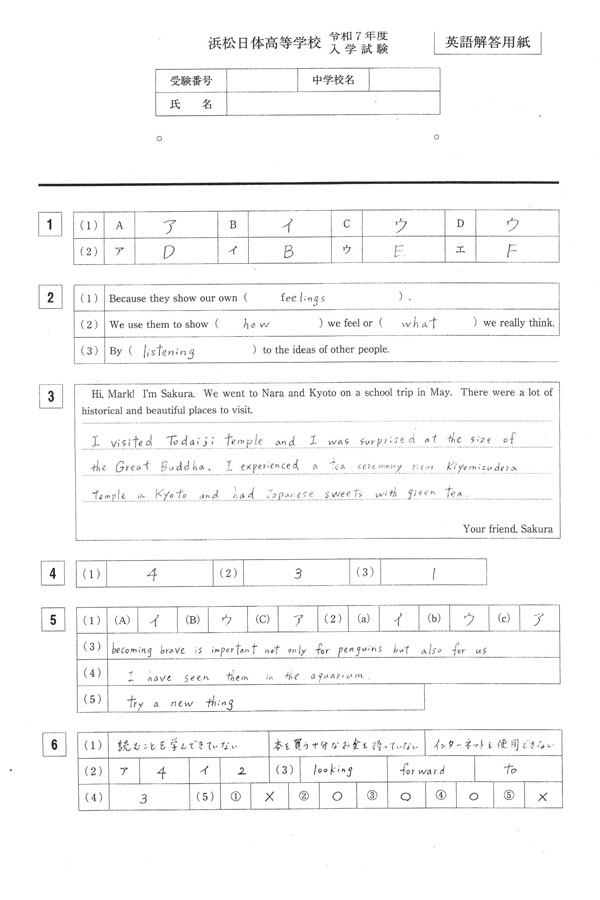令和7年度入試過去問題(英語 解答)(1ページ目)|浜松日体高等学校の入試過去問