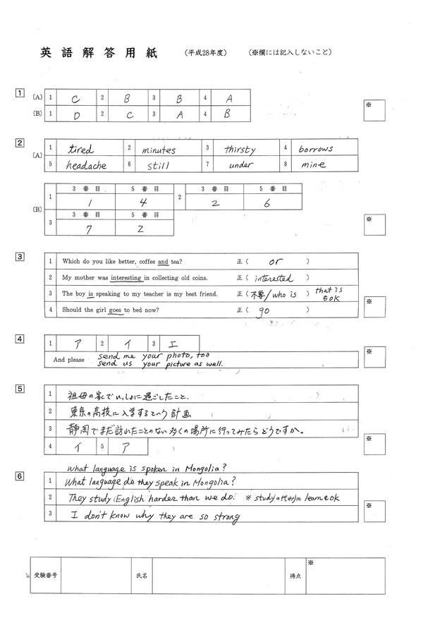 平成28年度入試過去問題(英語 解答)(1ページ目)|藤枝明誠高等学校の入試過去問