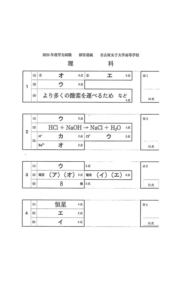 2024年度入試過去問題(理科 解答)(1ページ目)|名古屋葵大学高等学校の入試過去問