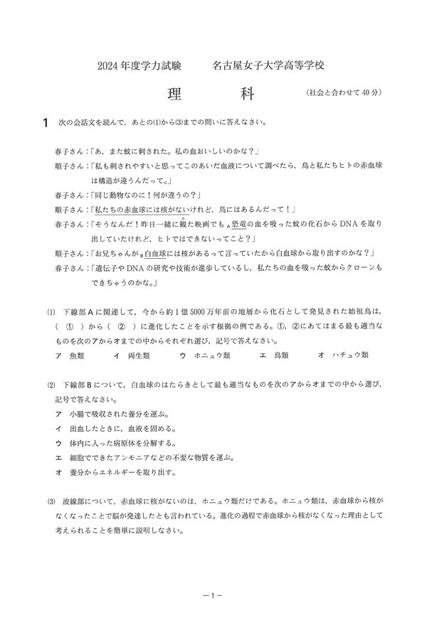 2024年度入試過去問題(理科 問題)(1ページ目)|名古屋葵大学高等学校の入試過去問