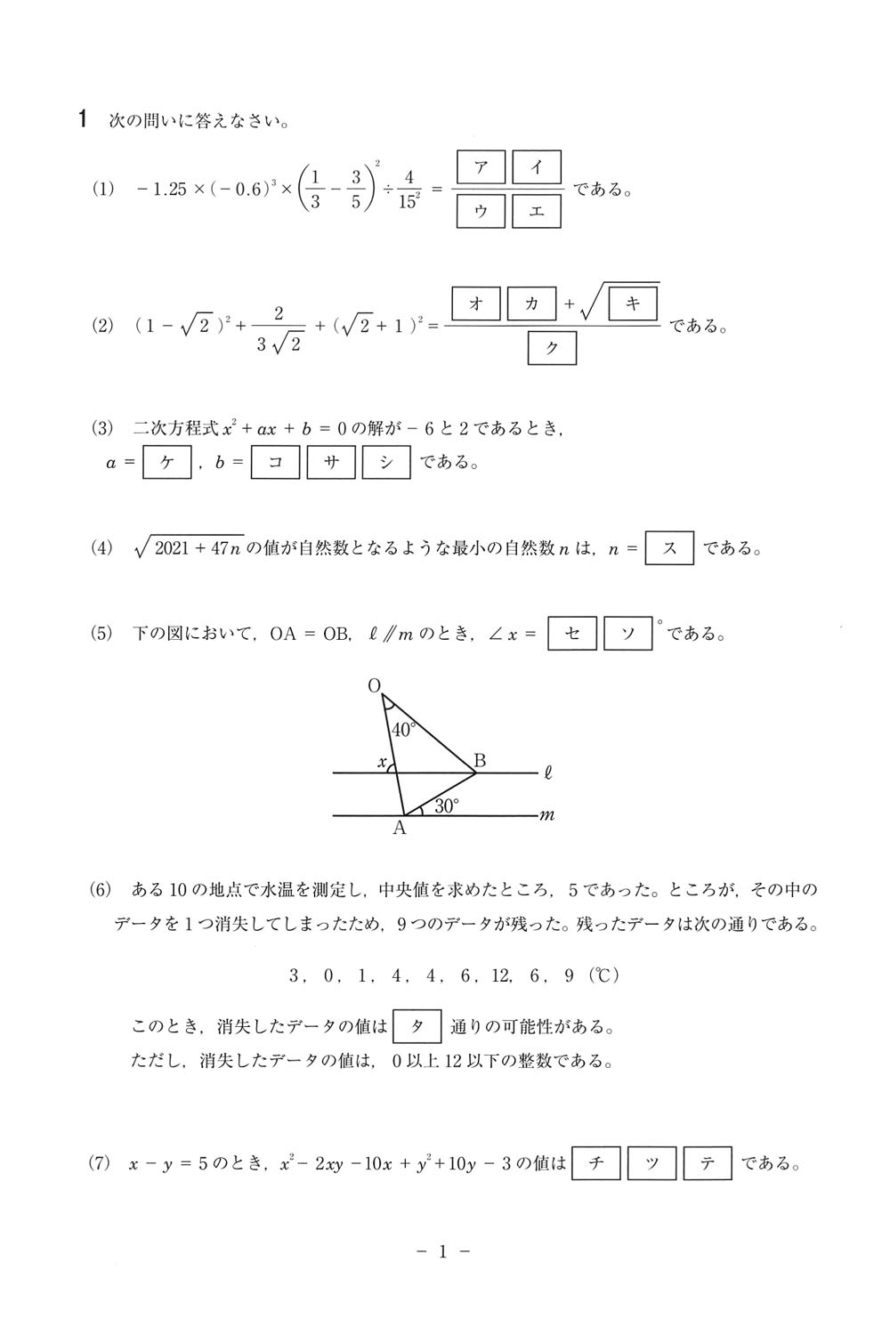 令和3年度入試過去問題(数学 問題)(1ページ目)|名城大学附属高等学校の入試過去問