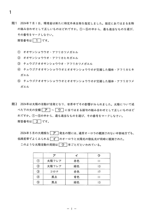 令和7年度入試過去問題(理科 問題)(1ページ目)|名城大学附属高等学校の入試過去問