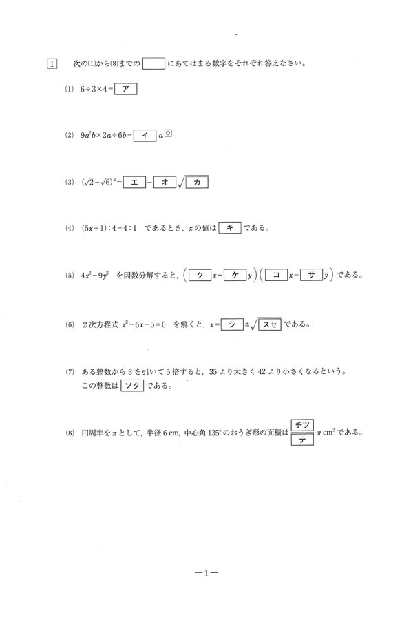 令和6年度入試過去問題(数学 問題)(1ページ目)|誠信高等学校の入試過去問