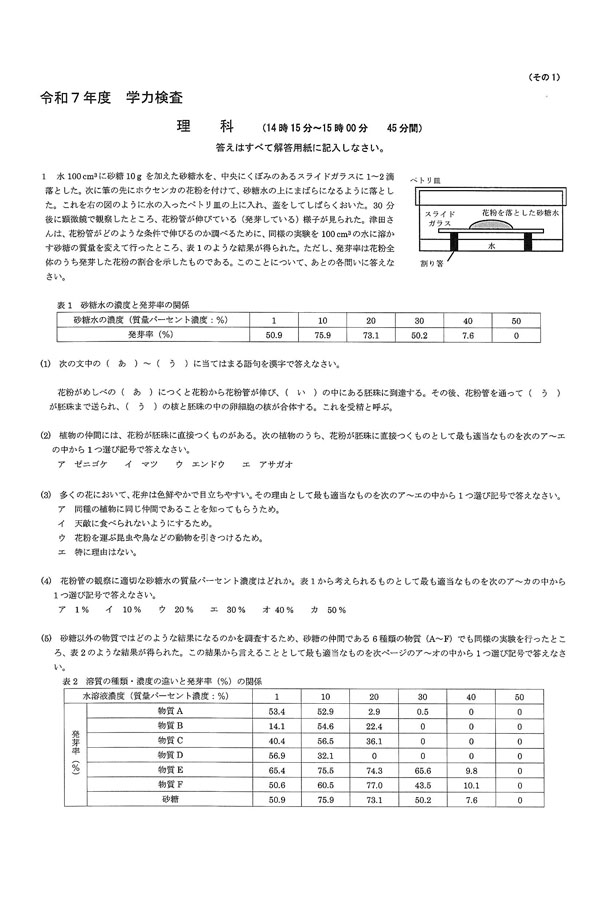 令和7年度入試過去問題(理科 問題)(1ページ目)|津田学園高等学校の入試過去問