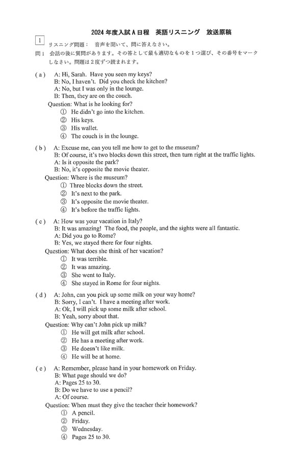 2024年度入試過去問題 A日程<特進ADVANCED・特進BASIC・進学コース>(英語 問題)(1ページ目)|京都先端科学大学附属高等学校の入試過去問