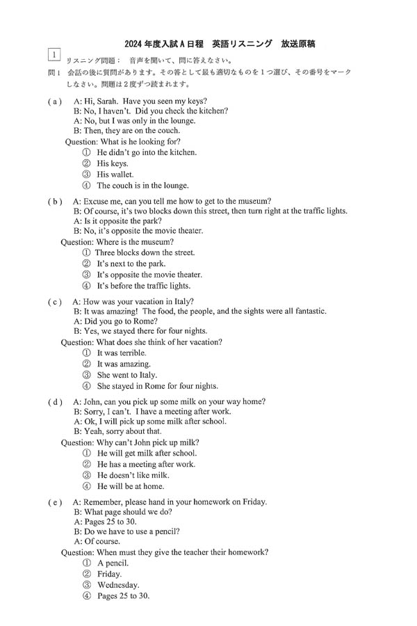 2024年度入試過去問題 A日程<国際コース>(英語 問題)(1ページ目)|京都先端科学大学附属高等学校の入試過去問
