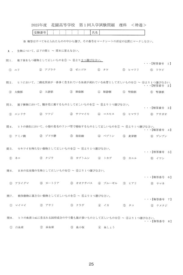 2025年度入試過去問題(第1回)<特進A・Bコース>(理科 問題)(1ページ目)|花園高等学校の入試過去問
