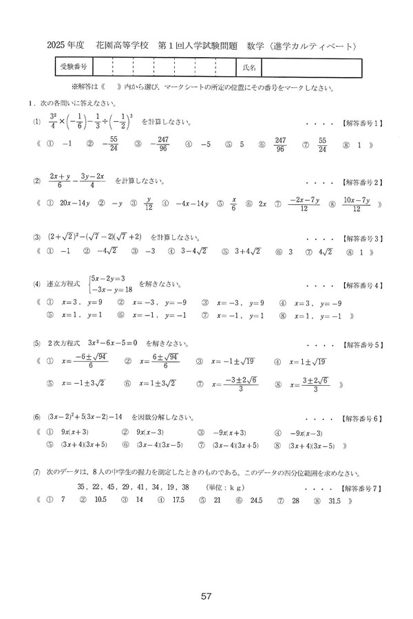 2025年度入試過去問題(第1回)<進学カルティベートコース>(数学 問題)(1ページ目)|花園高等学校の入試過去問