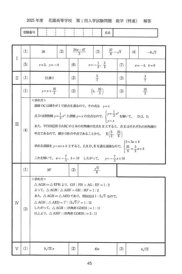2025年度入試過去問題(第1回)<特進A・Bコース>(数学 解答)(1ページ目)|花園高等学校の入試過去問