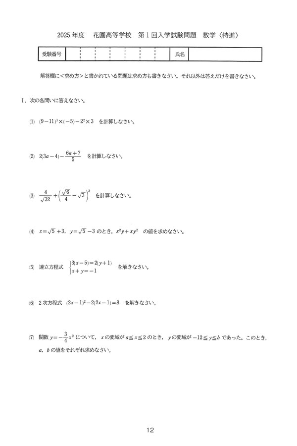 2025年度入試過去問題(第1回)<特進A・Bコース>(数学 問題)(1ページ目)|花園高等学校の入試過去問