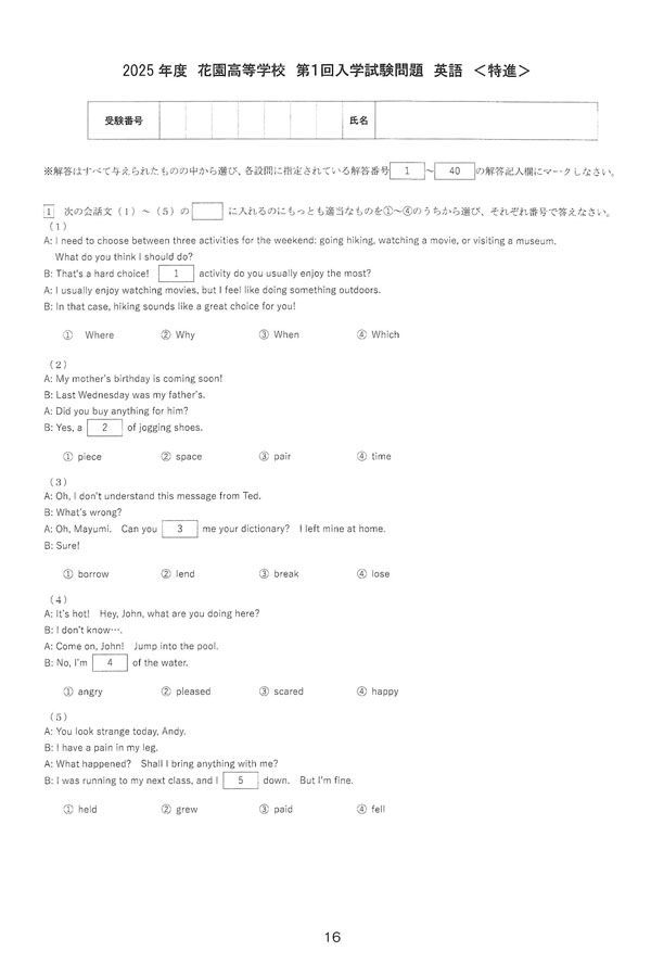 2025年度入試過去問題(第1回)<特進A・Bコース>(英語 問題)(1ページ目)|花園高等学校の入試過去問