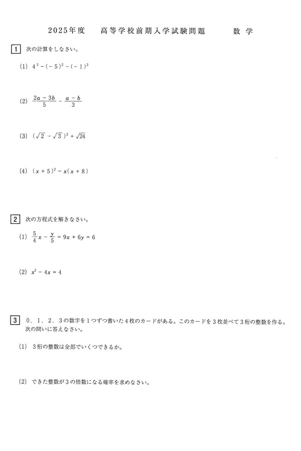 2025年度入試過去問題(数学 問題)(1ページ目)|京都文教高等学校の入試過去問