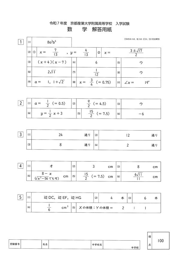 令和7年度入試過去問題(数学 解答)(1ページ目)|京都産業大学附属高等学校の入試過去問