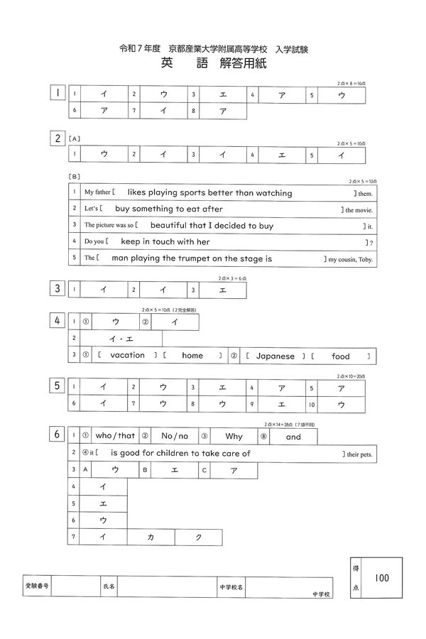 令和7年度入試過去問題(英語 解答)(1ページ目)|京都産業大学附属高等学校の入試過去問