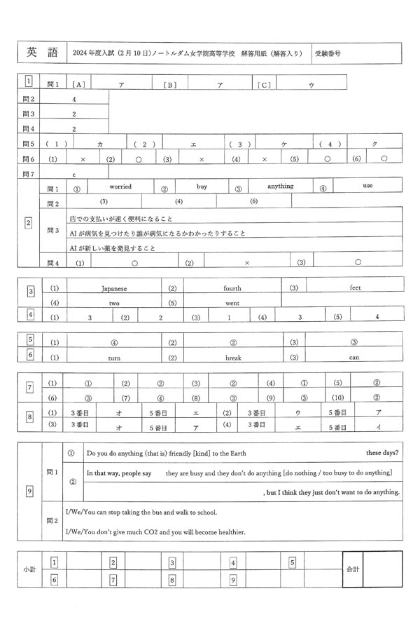 2024年度入試過去問題(英語 解答)(1ページ目)|ノートルダム女学院高等学校の入試過去問