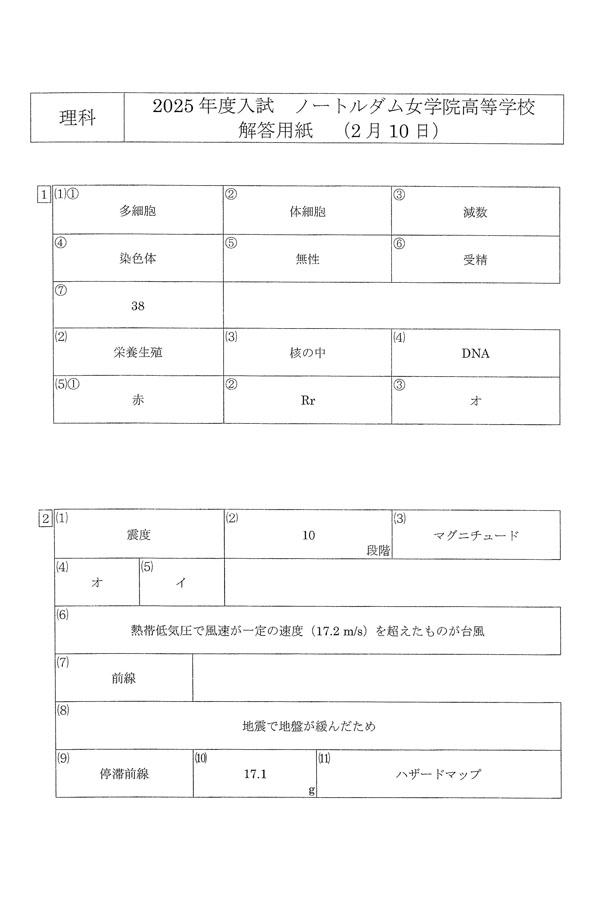 2025年度入試過去問題(理科 解答)(1ページ目)|ノートルダム女学院高等学校の入試過去問
