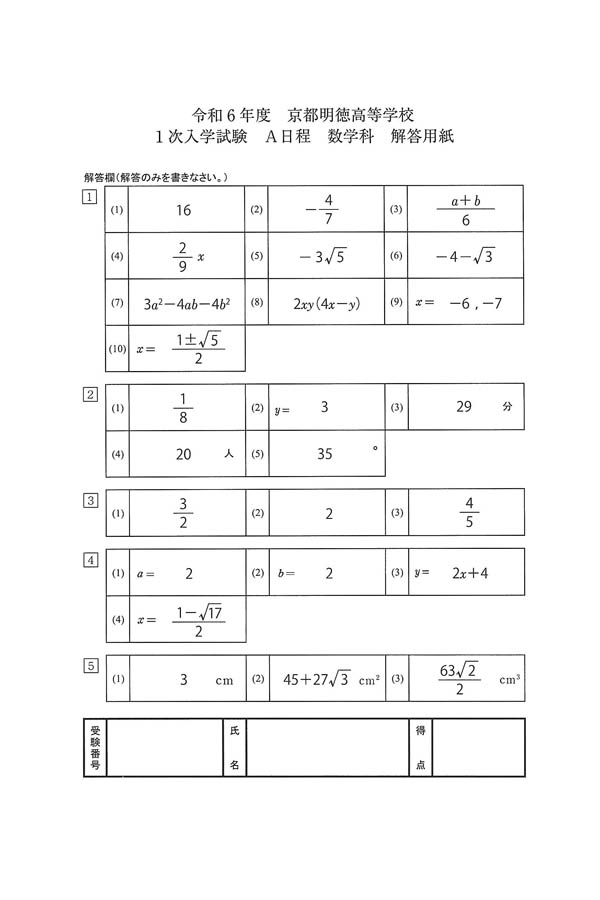 2024年度入試過去問題 A日程(数学 解答)(1ページ目)|京都明徳高等学校の入試過去問