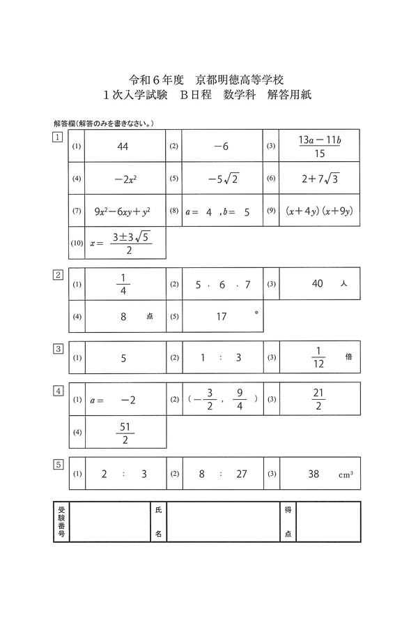 2024年度入試過去問題 B日程(数学 解答)(1ページ目)|京都明徳高等学校の入試過去問