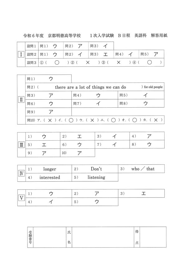 2024年度入試過去問題 B日程(英語 解答)(1ページ目)|京都明徳高等学校の入試過去問