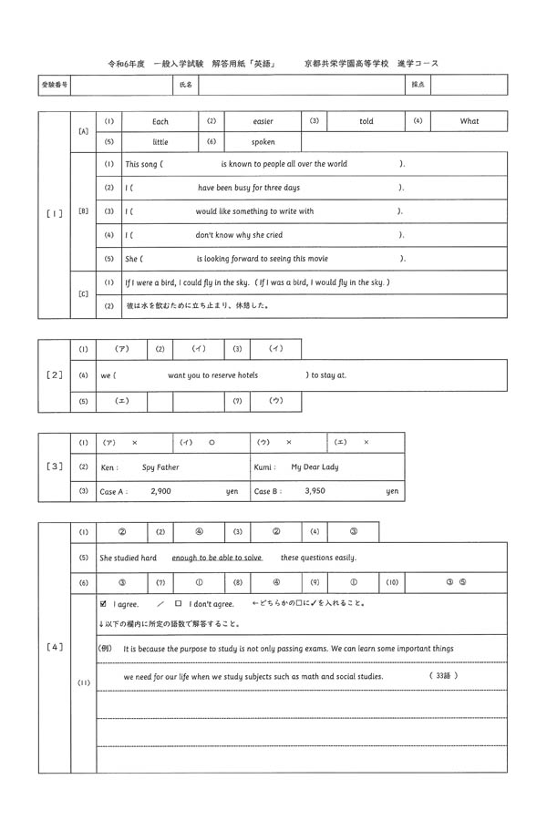 令和6年度入試過去問題(進学コース)(英語 解答)(1ページ目)|京都共栄学園高等学校の入試過去問
