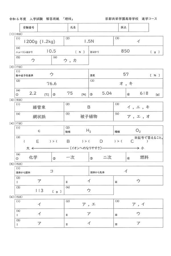 令和6年度入試過去問題(進学コース)(理科 解答)(1ページ目)|京都共栄学園高等学校の入試過去問