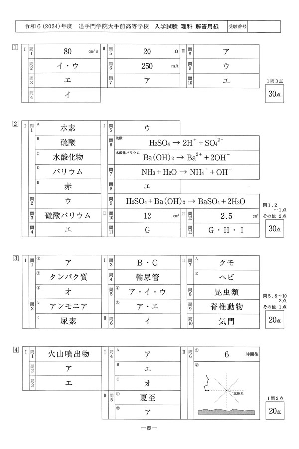 2024年度入試過去問題(理科 解答)(1ページ目)|追手門学院大手前高等学校の入試過去問