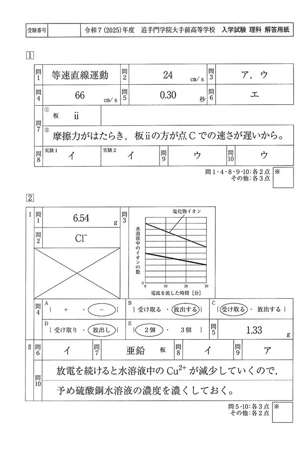 2025年度入試過去問題(理科 解答)(1ページ目)|追手門学院大手前高等学校の入試過去問
