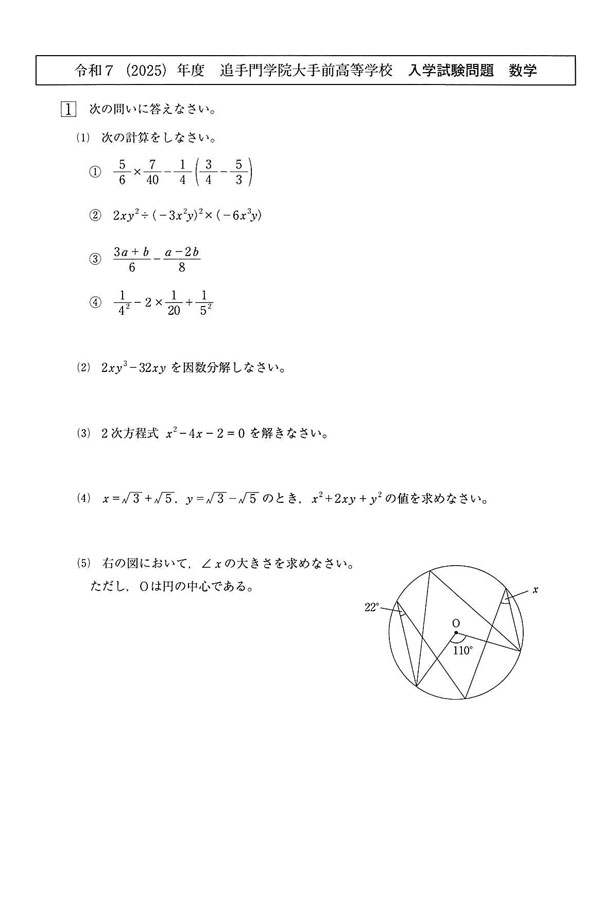 2025年度入試過去問題(数学 問題)(1ページ目)|追手門学院大手前高等学校の入試過去問