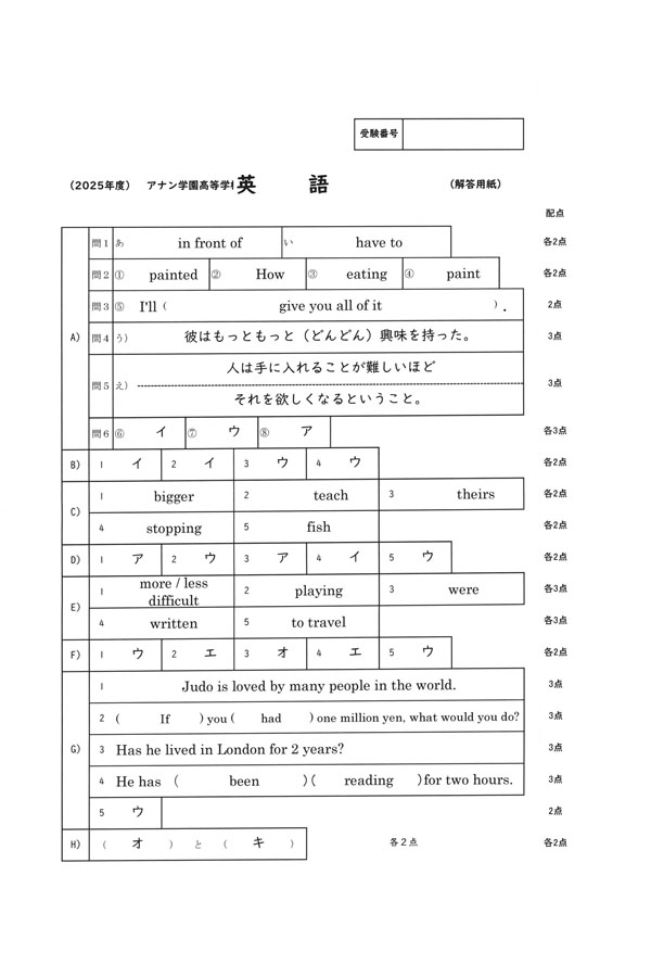 2025年度入試過去問題(英語 解答)(1ページ目)|アナン学園高等学校の入試過去問