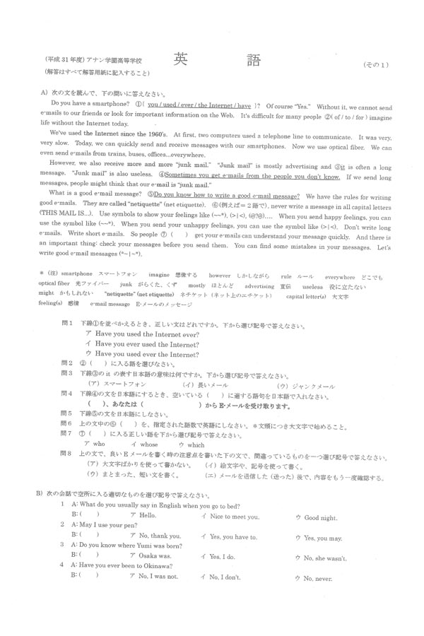 入試過去問(問題)(1ページ目)|アナン学園高等学校の入試過去問