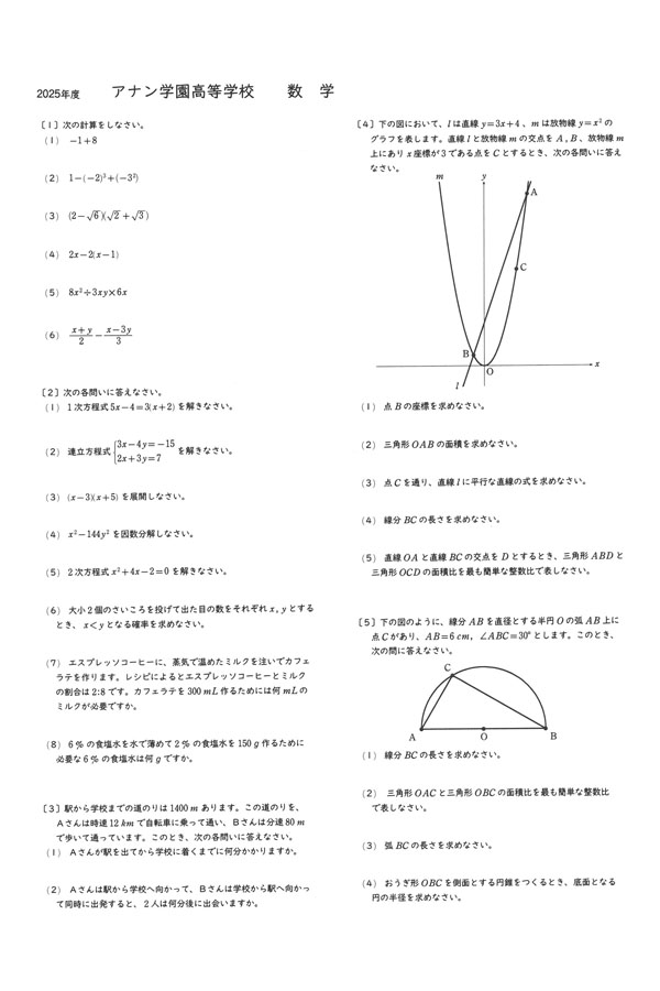 2025年度入試過去問題(数学 問題)(1ページ目)|アナン学園高等学校の入試過去問