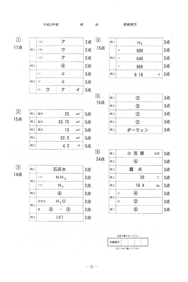 平成29年度入試過去問題(理科 解答)(1ページ目)|関西大倉高等学校の入試過去問