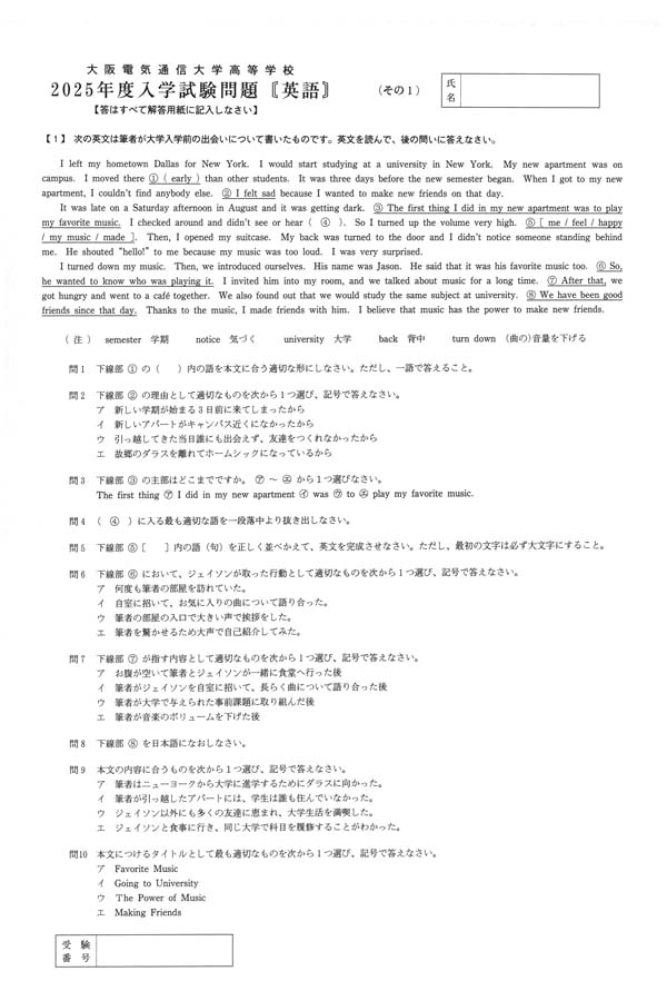 2025年度入試過去問題(英語 問題)(1ページ目)|大阪電気通信大学高等学校の入試過去問