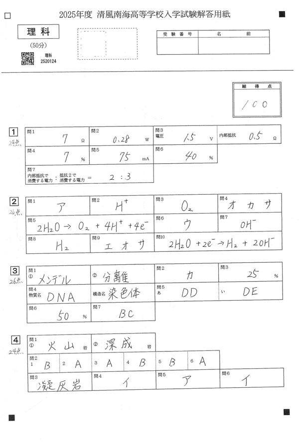 2025年度入試過去問題(理科 解答)(1ページ目)|清風南海高等学校の入試過去問