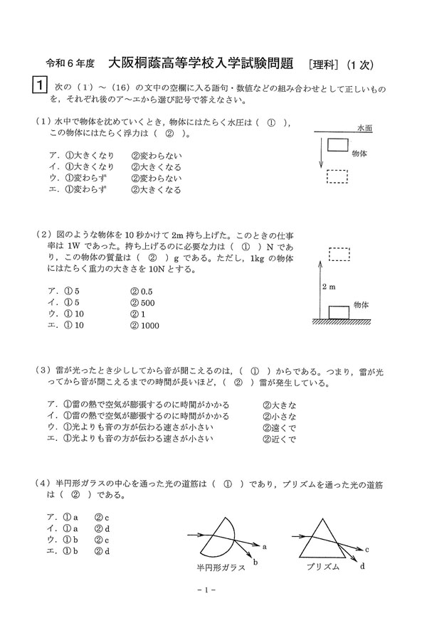令和5年度入試過去問題 一次(理科 問題)(1ページ目)|大阪桐蔭高等学校の入試過去問