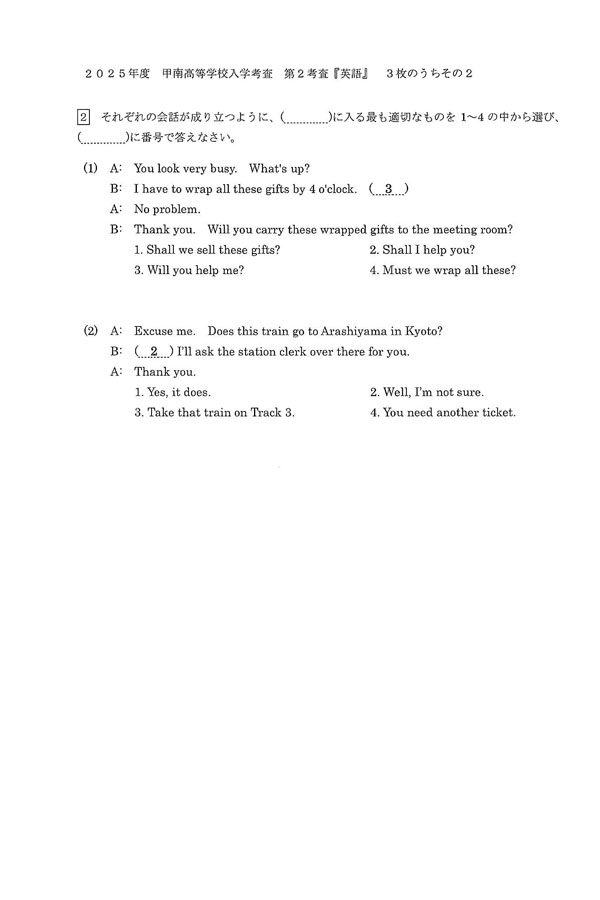 2025年度入試過去問題(英語 解答)(1ページ目)|甲南高等学校の入試過去問