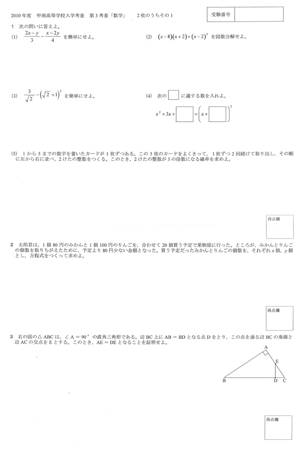 平成22年度入試過去問題 (数学 問題)(1ページ目)|甲南高等学校の入試過去問