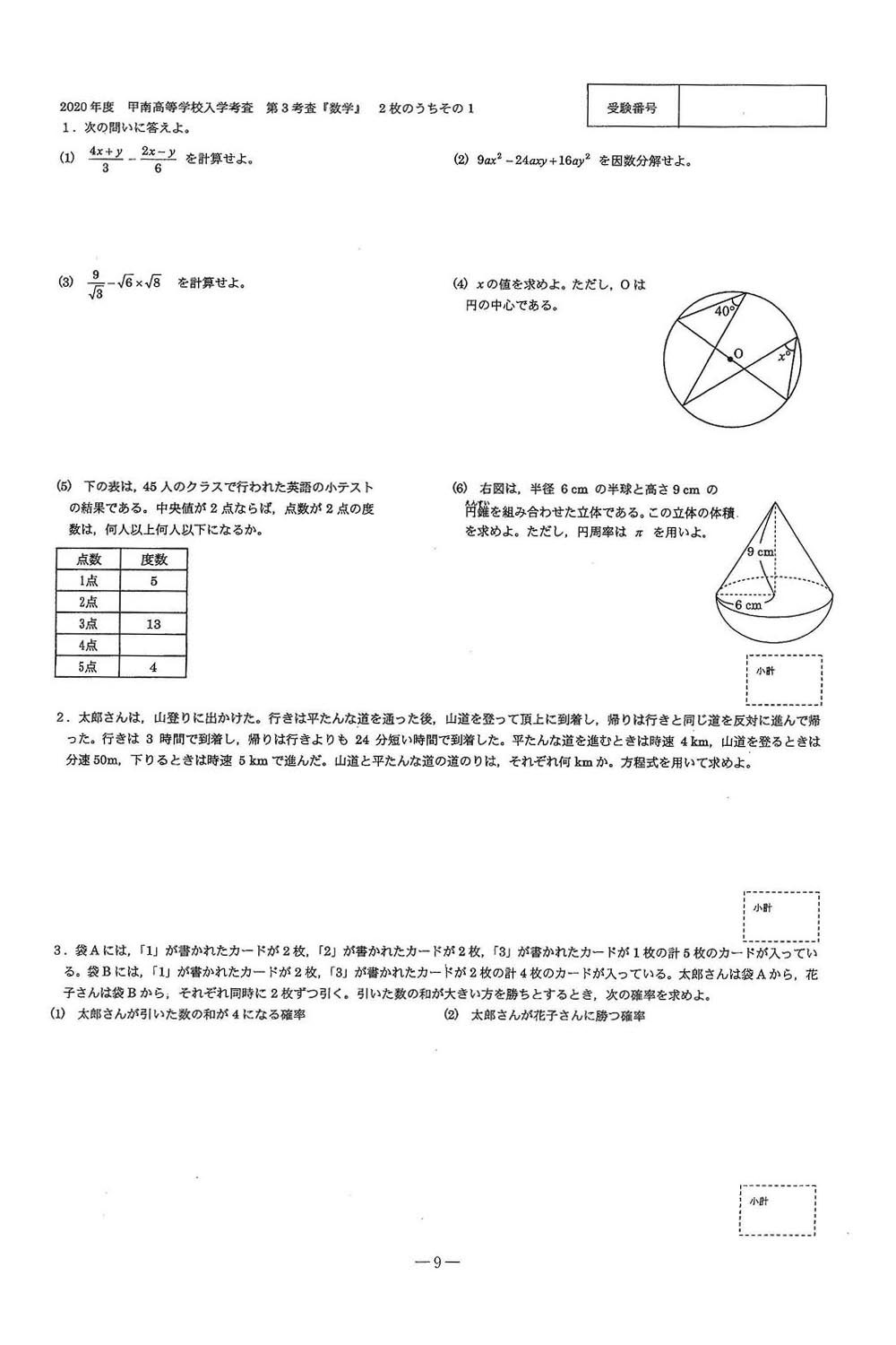 2020年度入試過去問題(数学 問題)(1ページ目)|甲南高等学校の入試過去問